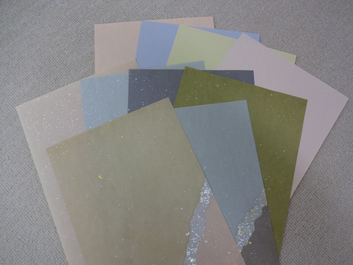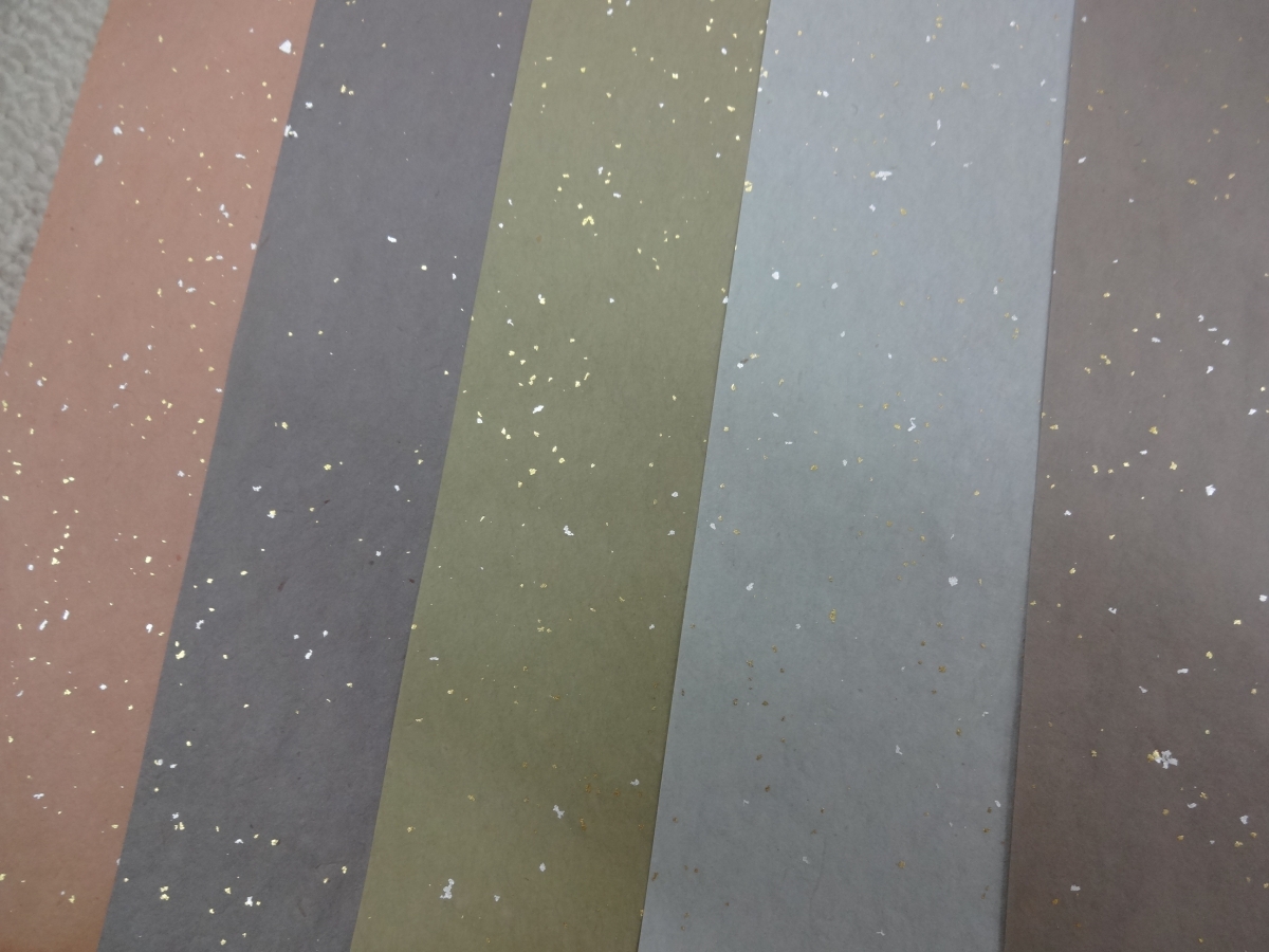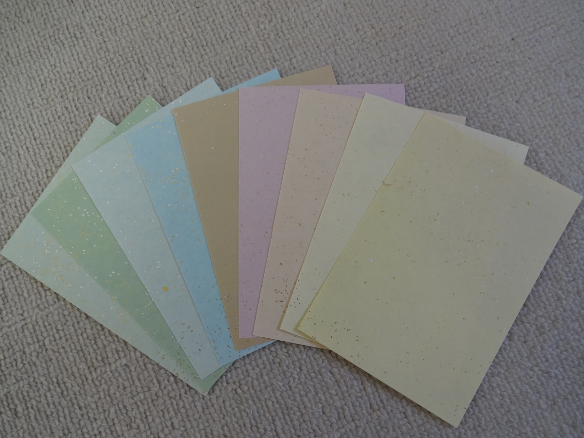 写真は、草木染の料紙 はがきサイズで、砂子を撒いて仕上げてあります。