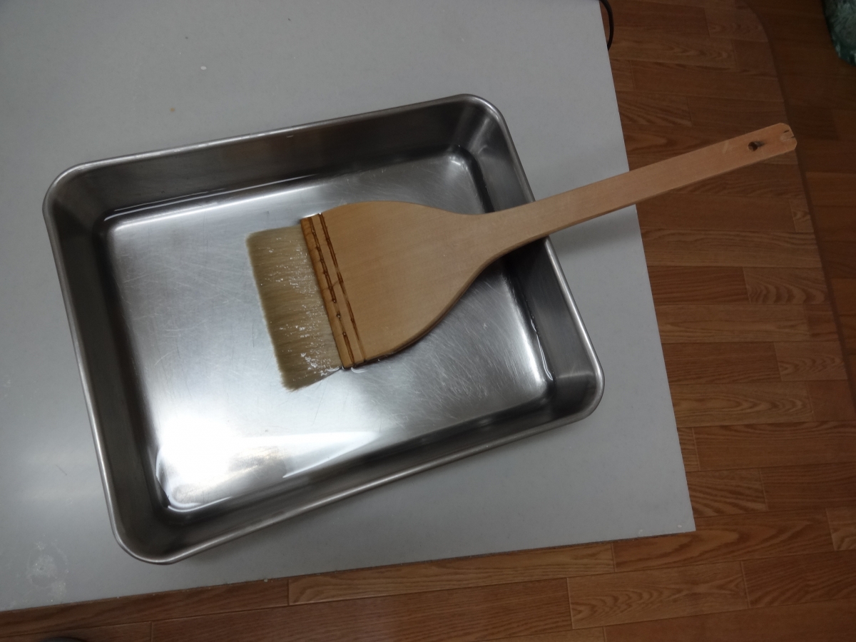 薄い膠の液を最初に紙に引きます。